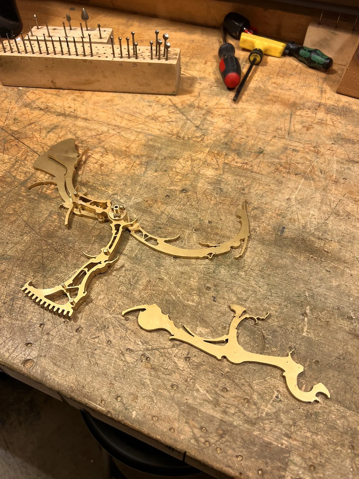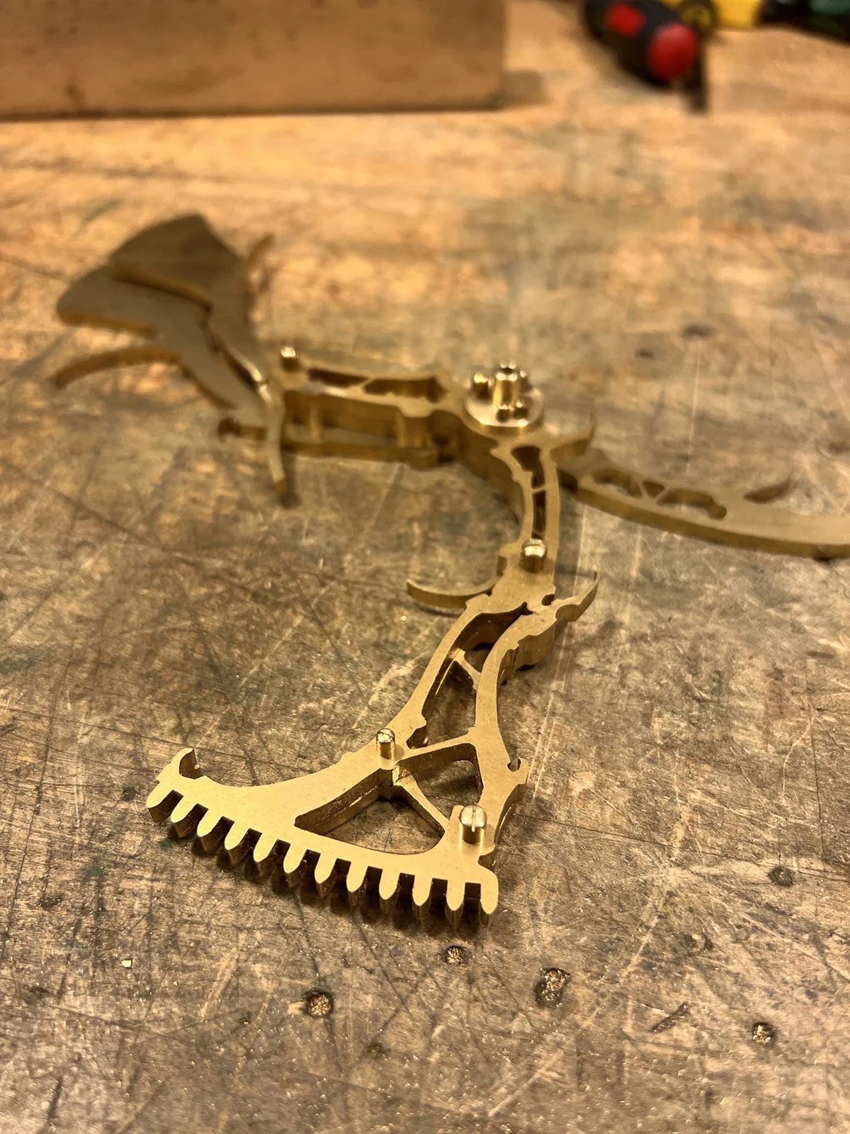 The main pair of scissoring arms are what will control the calendar part of the mechanism. The short rack of gear teeth will mesh with a set of gears for a drag-fan that will spin and soften the motion of the arm when it drops at the end of every day. Kind of a fun part to make.