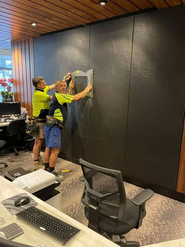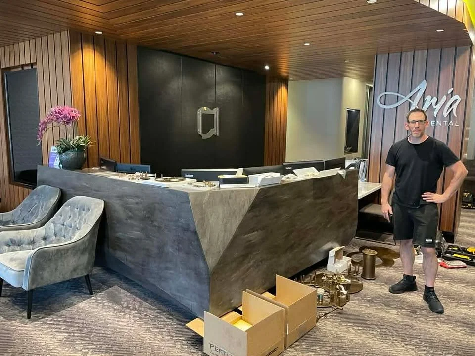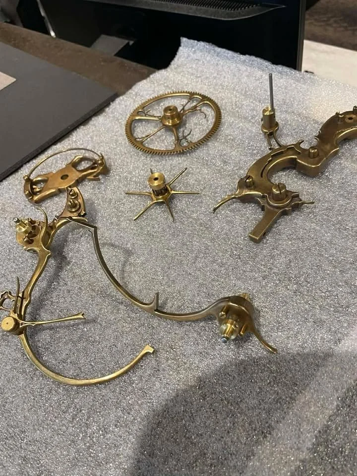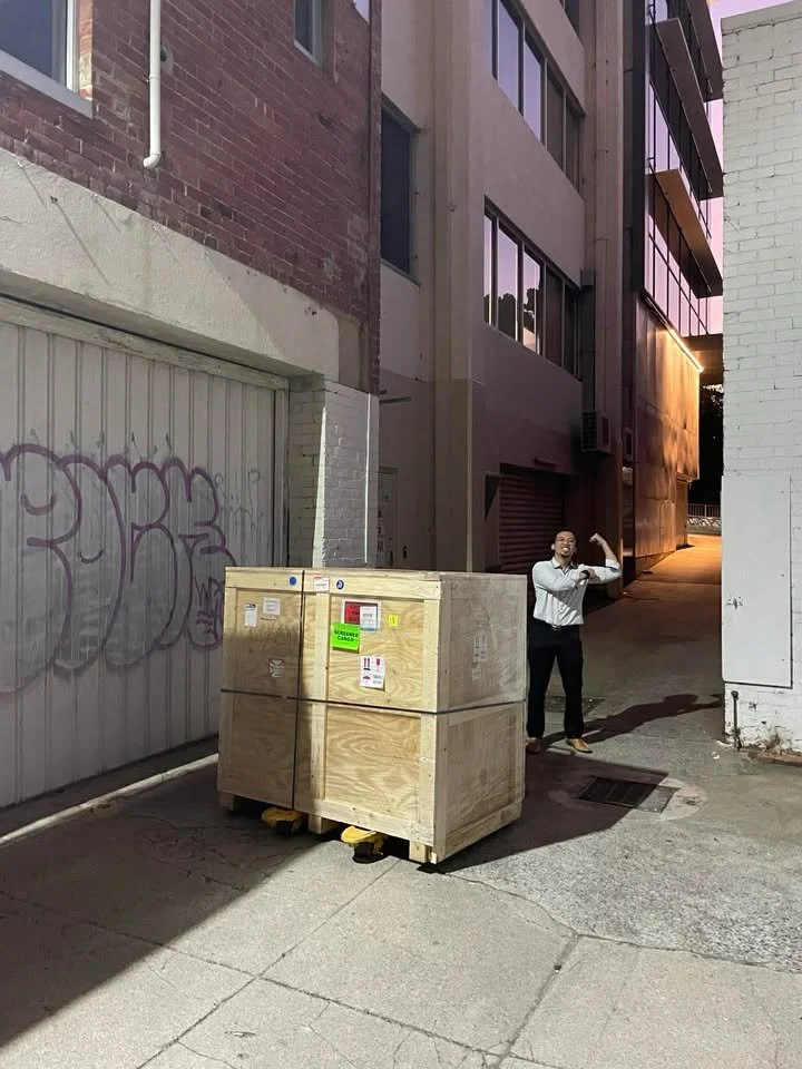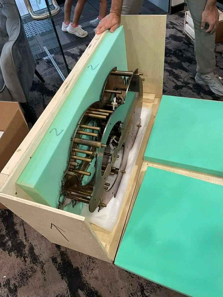 Two years ago the clock titled “Perth” was delivered to the city in Western Australia it was named after. When the crate first arrived, the father of the clocks owner was helping accommodate the delivery, and was snapping some pictures. He recently reached out to me with the photos, and an interesting bit of info. Apparently when the shipment arrived, it wouldn’t fit through the front door of the building, so they had to wheel the heavy crate down the street, down the alley, and into the parking garage below. There it would wait for me to arrive, unpack, and assemble this giant wall-hung piece.